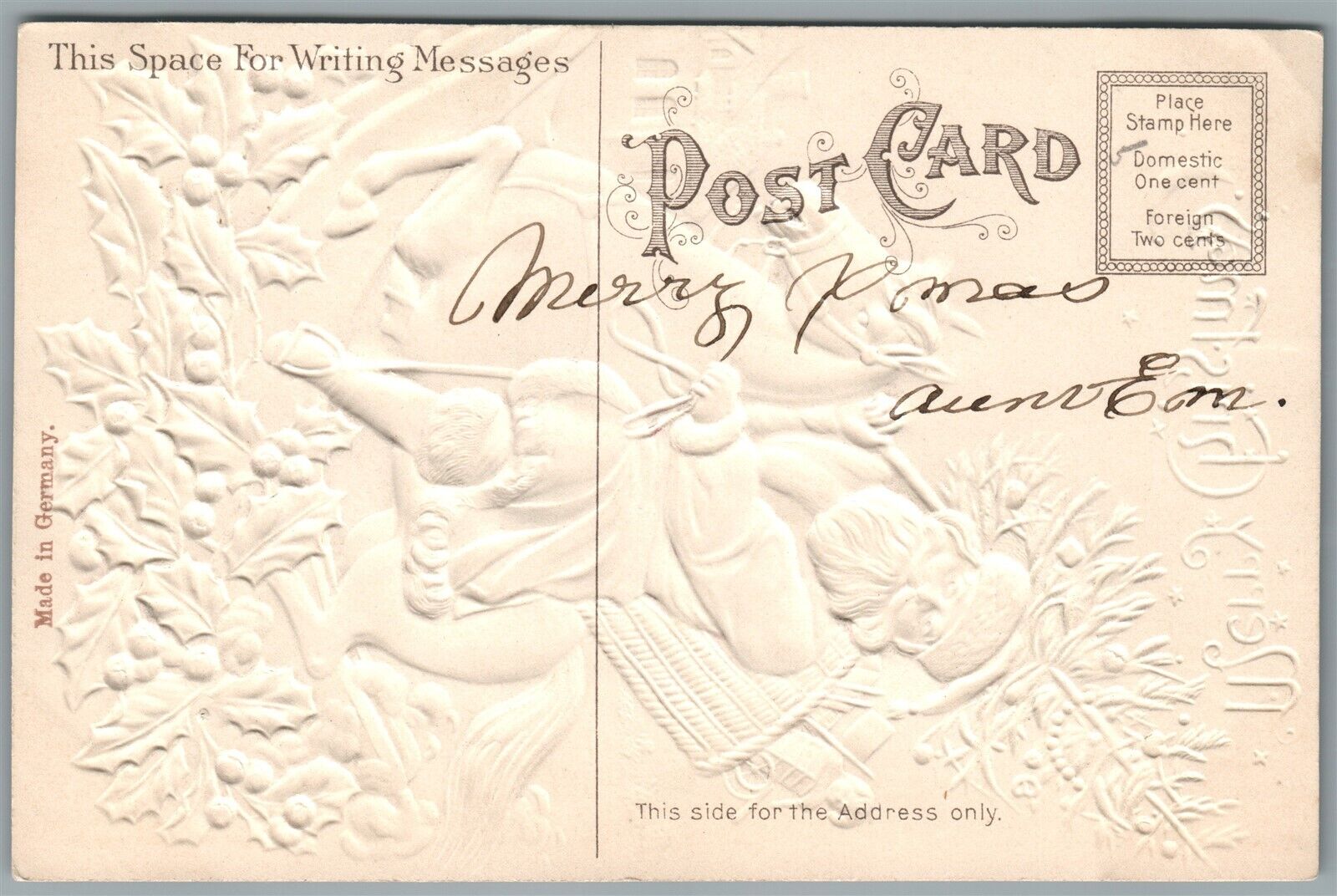 SANTA RIDING TOY HORSE MERRY CHRISTMAS EMBOSSED ANTIQUE POSTCARD