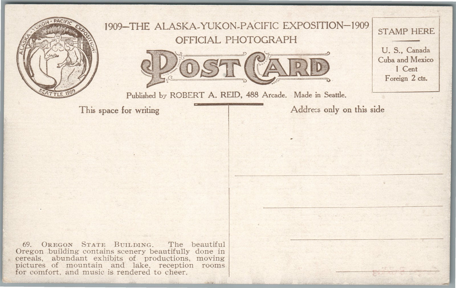 SEATTLE WA 1909 ALASKA YUKON PACIFIC EXPOSITION OREGON BUILDING ANTIQUE POSTCARD