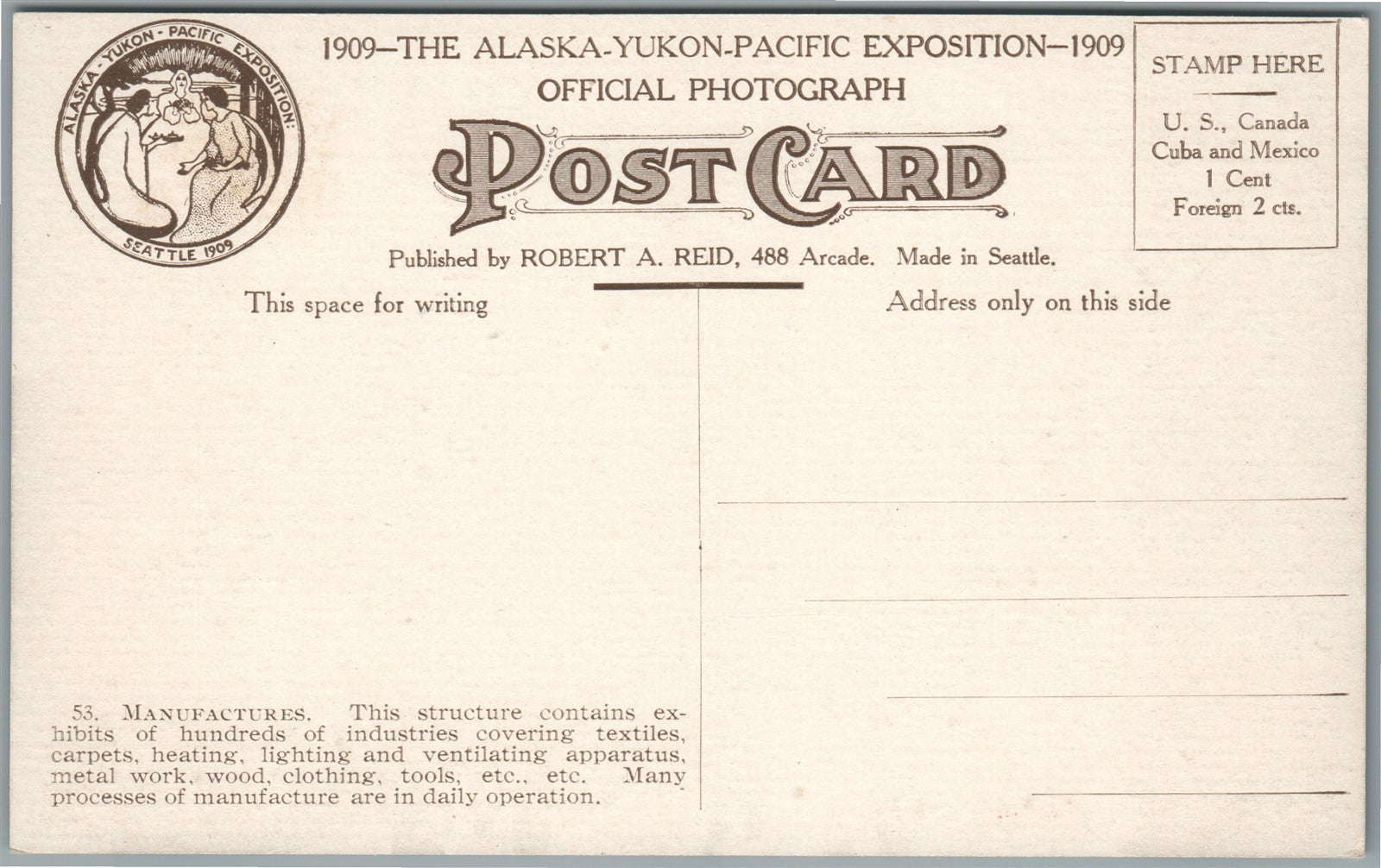 SEATTLE WA ALASKA YUKON PACIFIC EXPOSITION MANUFACTURE PALACE ANTIQUE POSTCARD