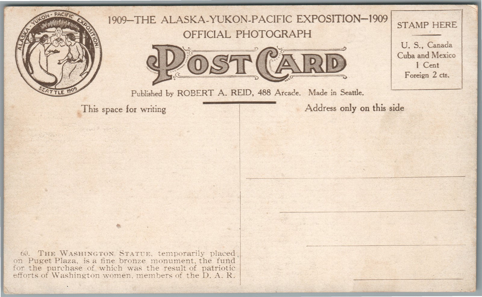 SEATTLE WA ALASKA YUKON PACIFIC EXPOSITION WASHINGTON STATUE ANTIQUE POSTCARD