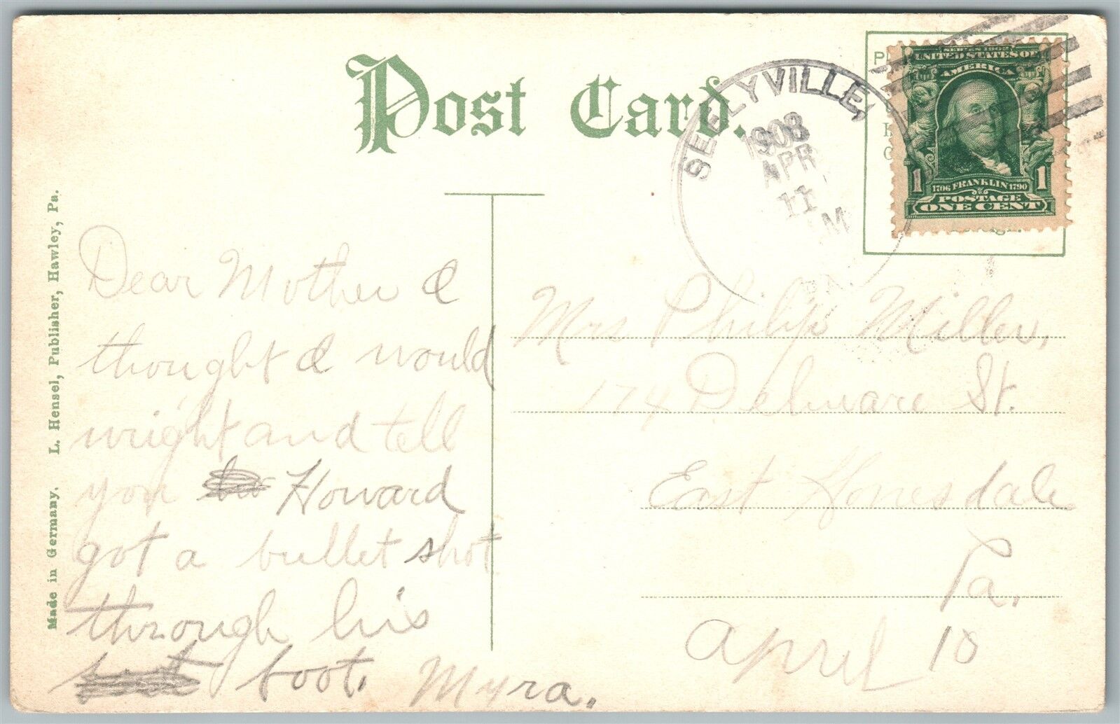 SEELYVILLE PA LACKAWAXEN RIVER 1908 ANTIQUE POSTCARD