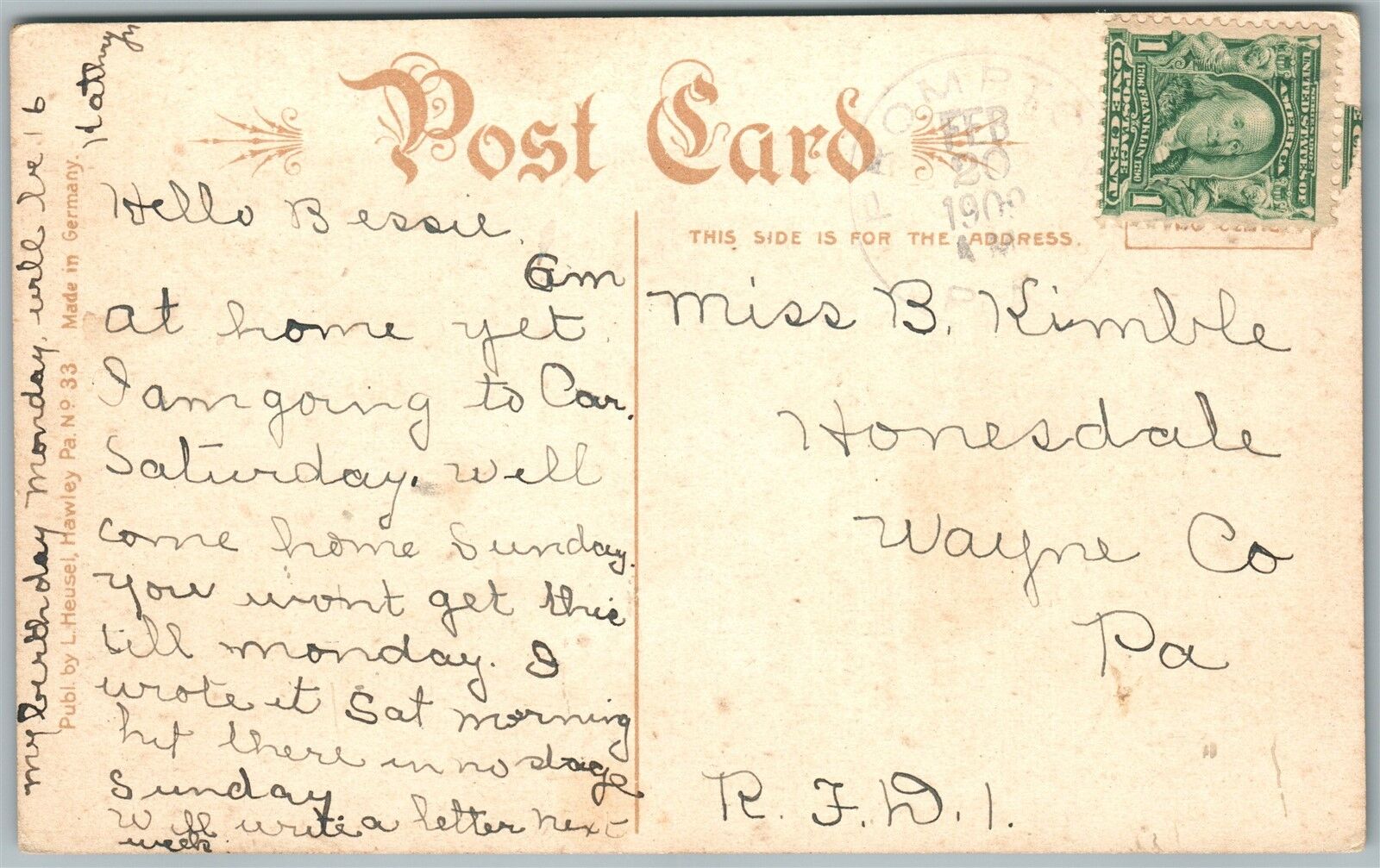 SEELYVILLE WAYNE COUNTY PA 1909 ANTIQUE POSTCARD