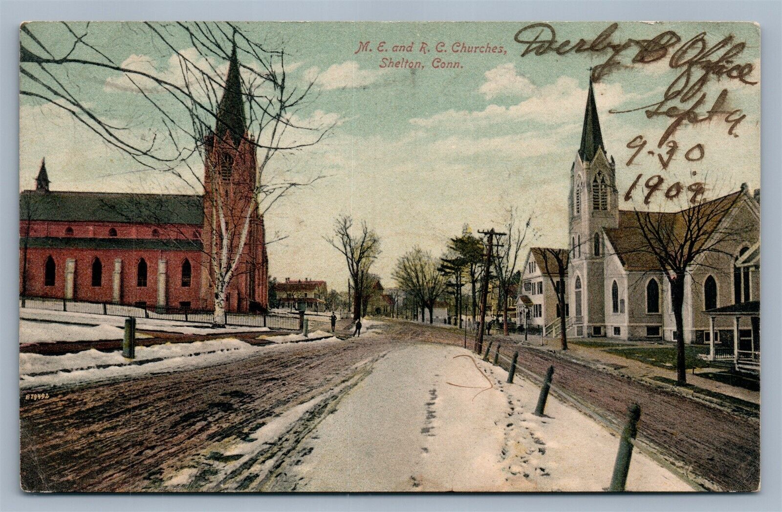 SHELTON CT ME & RC CHURCHES ANTIQUE POSTCARD
