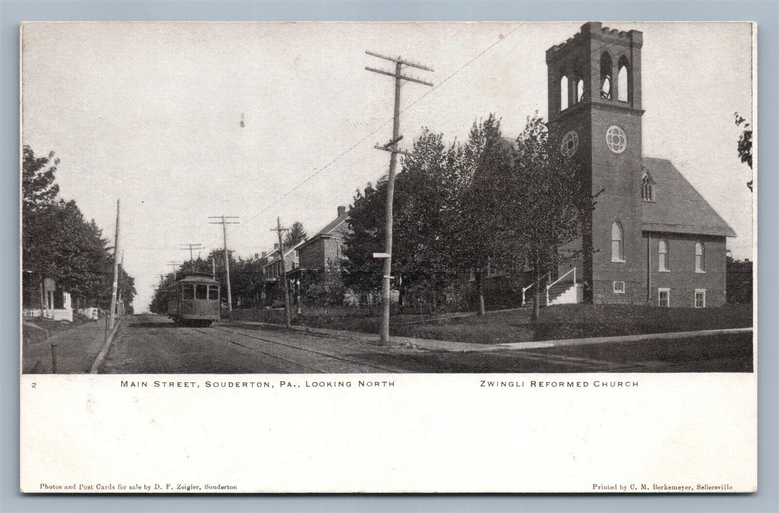SOUDERTON PA MAIN STREET ZWINGLI REFORMED CHURCH ANTIQUE DOUBLE SIDED POSTCARD