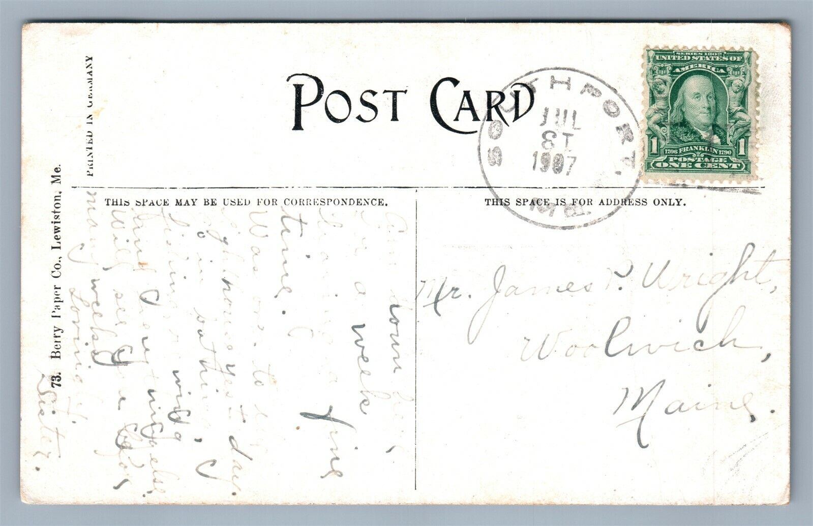 SOUTHPORT ME HENDRICK'S HEAD LIGHTHOUSE 1907 ANTIQUE POSTCARD