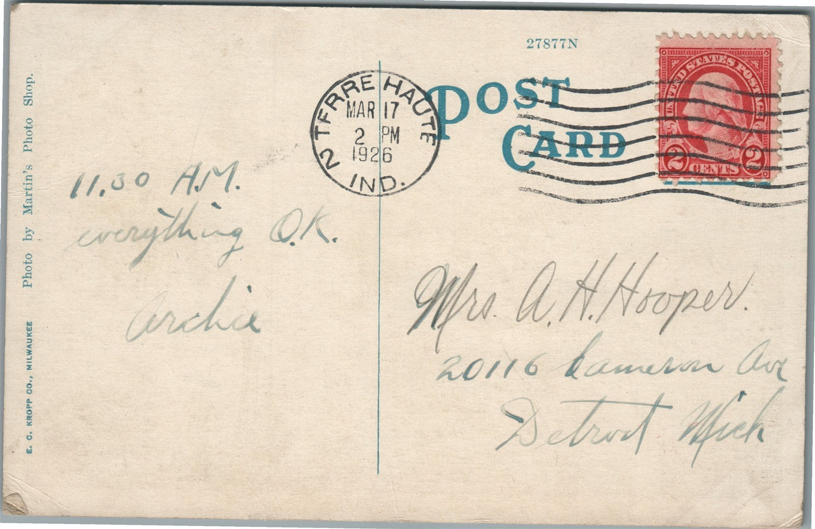 TERRE HAUTE IN WABASH AVE. ANTIQUE POSTCARD