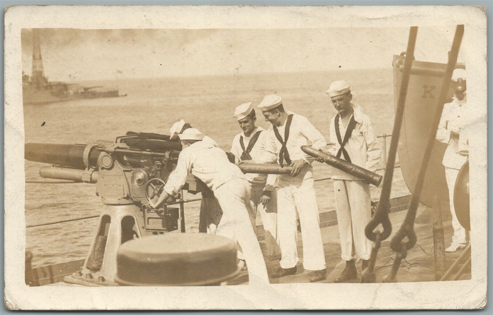 USS KANSAS CANNON CREW ANTIQUE REAL PHOTO POSTCARD RPPC w/ SHIP CANCEL