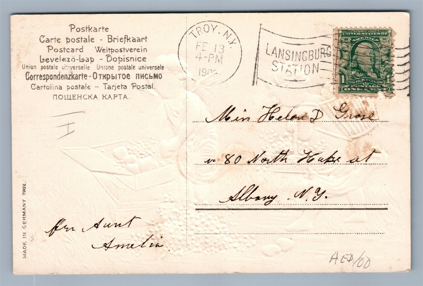 VALENTINE ANTIQUE POSTCARD ANGEL GIRLS BOX of HEARTS IN APPLIQUE CLOTH DRESSES