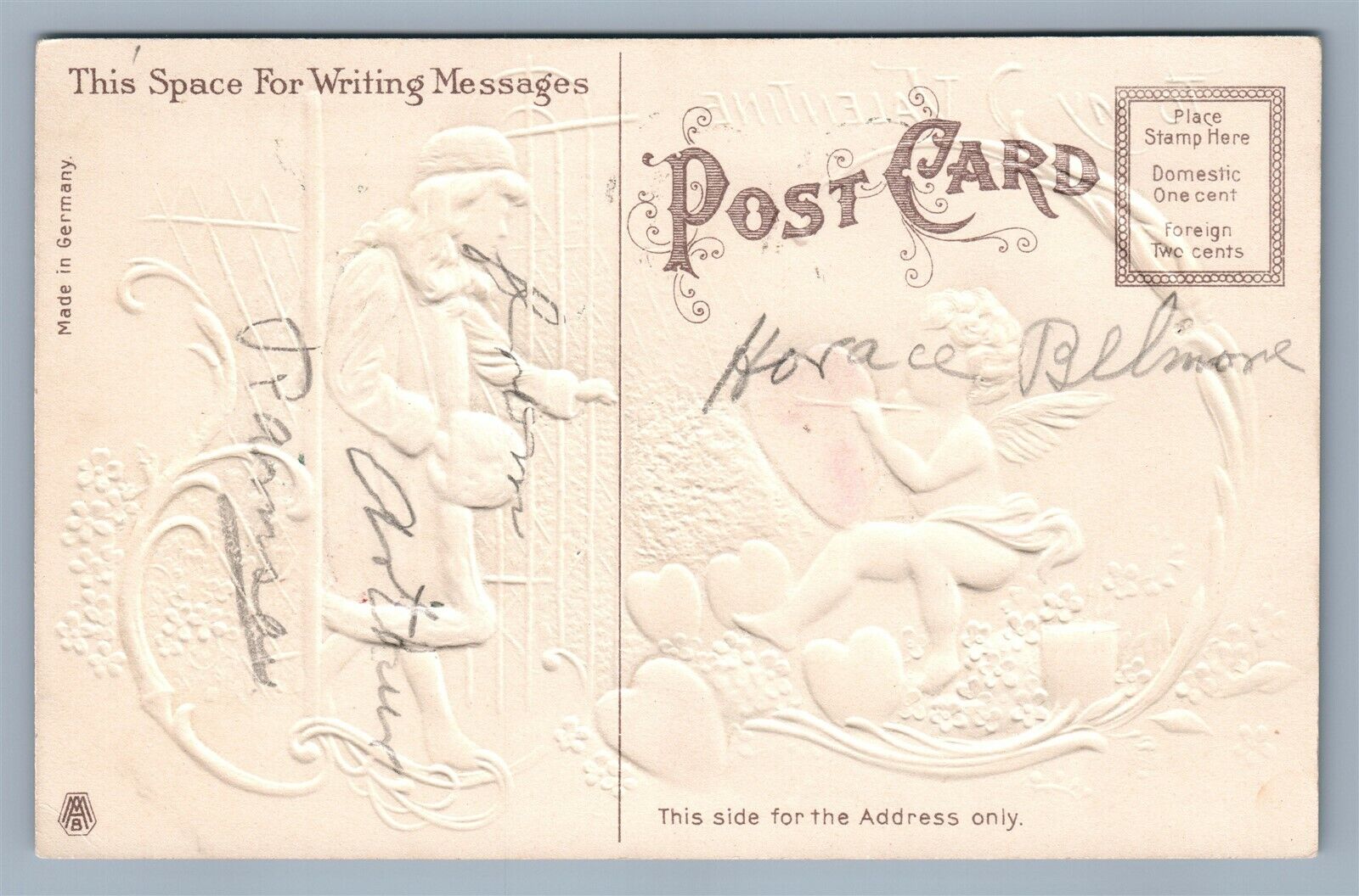 VALENTINE ANTIQUE POSTCARD CUPID w/ SILK HEART GIRL WITH APPLIQUE COAT