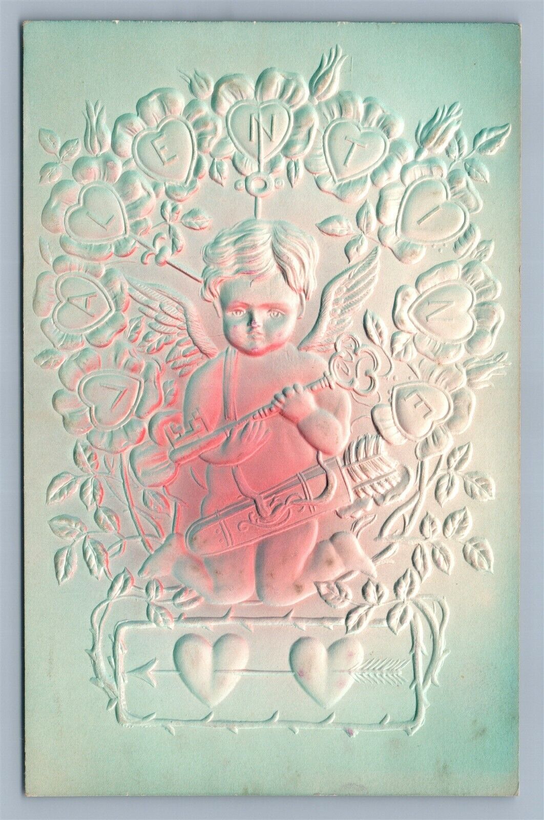 VALENTINE DEEPLY EMBOSSED ANTIQUE POSTCARD CUPID w/ KEY