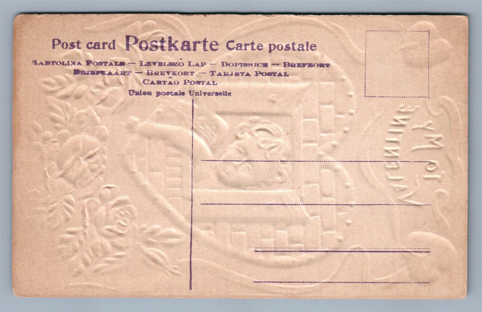 VALENTINE EMBOSSED ANTIQUE POSTCARD CUPID in WINDOW