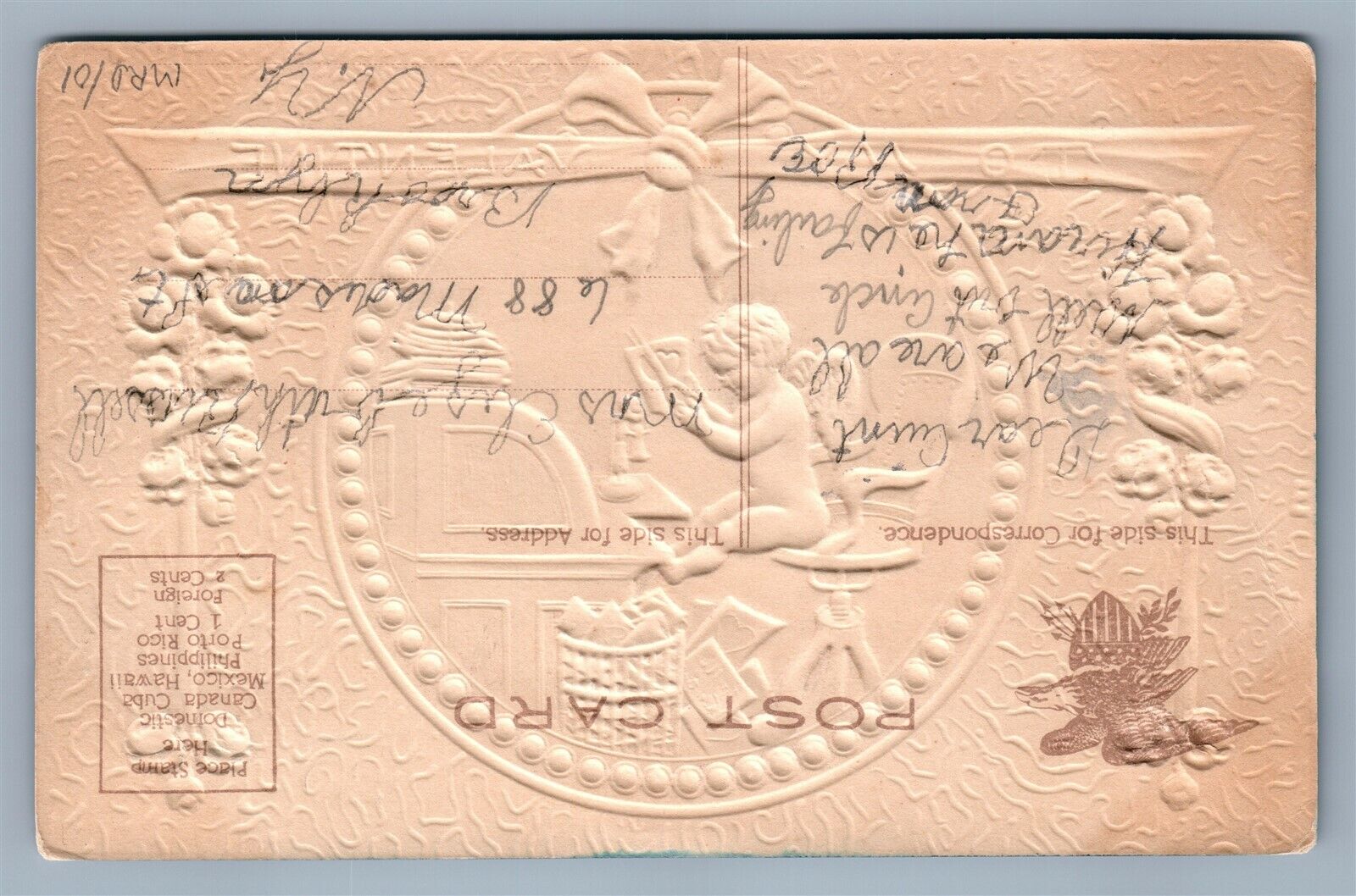 VALENTINE EMBOSSED ANTIQUE POSTCARD CUPID READING LETTERS