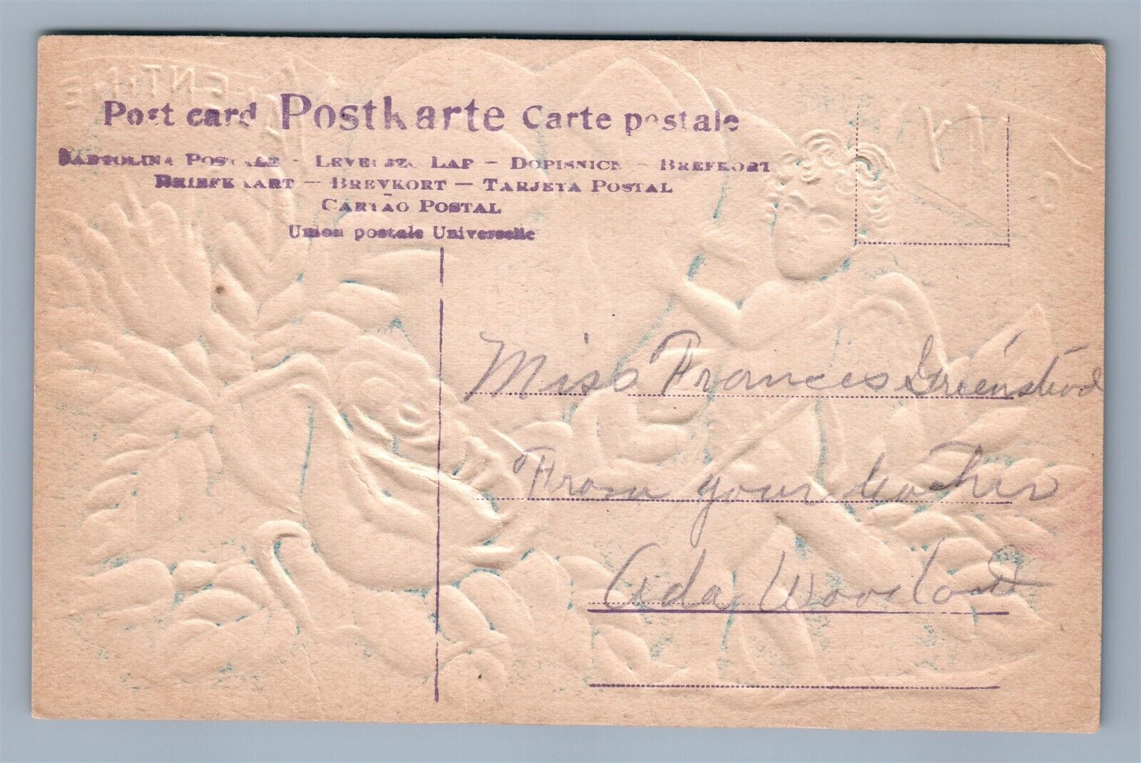 VALENTINE EMBOSSED ANTIQUE POSTCARD CUPID w/ ARROW IN FLOWERS