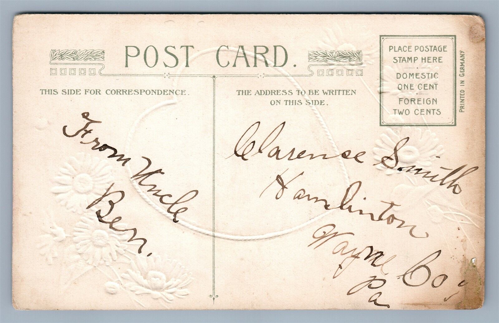 VALENTINE EMBOSSED ANTIQUE POSTCARD PRINTED ON SILK KIDS w/ FLOWERS