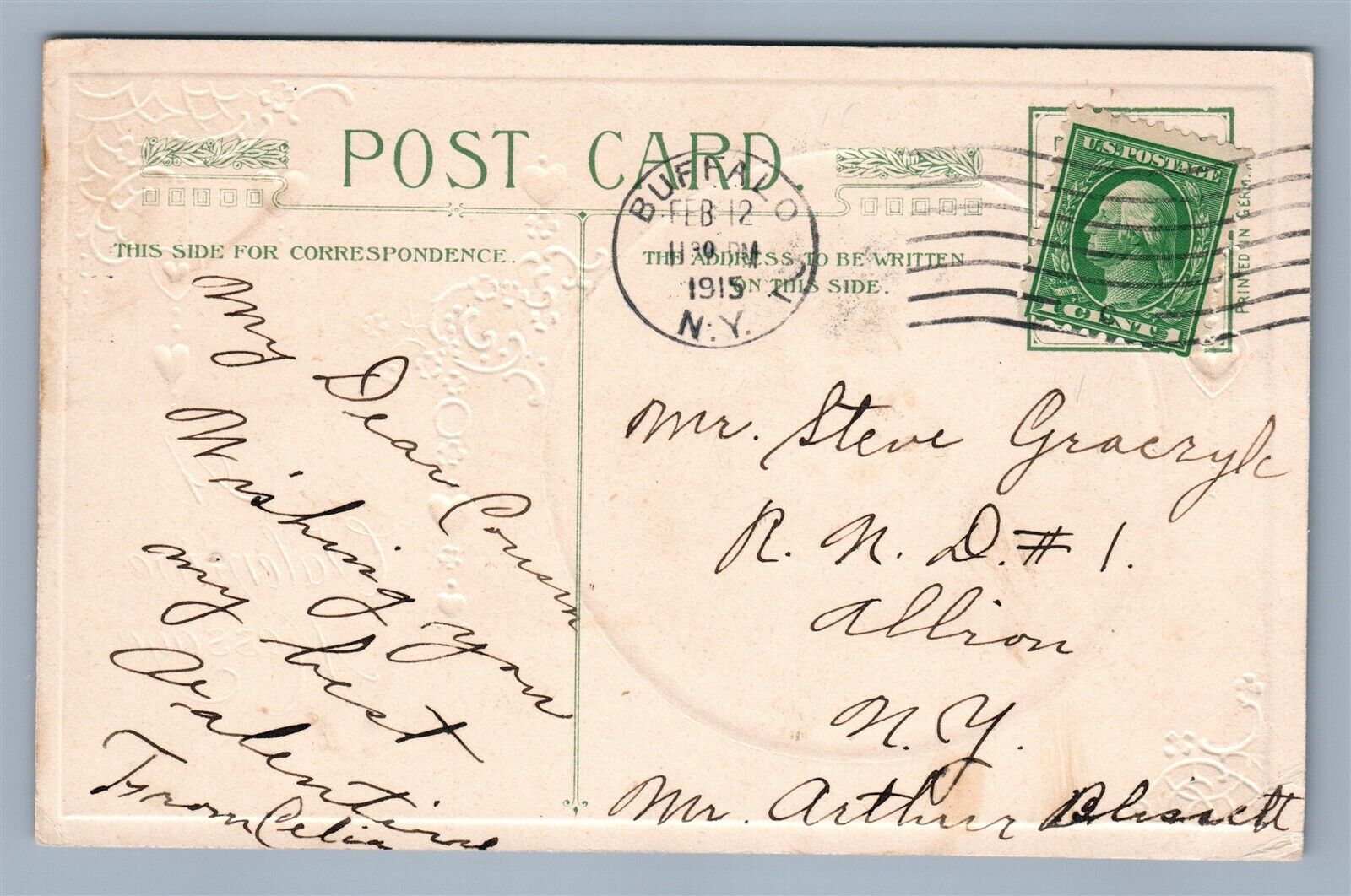 VALENTINE MESSAGE 1913 EMBOSSED ANTIQUE POSTCARD by JOHN WINSCH