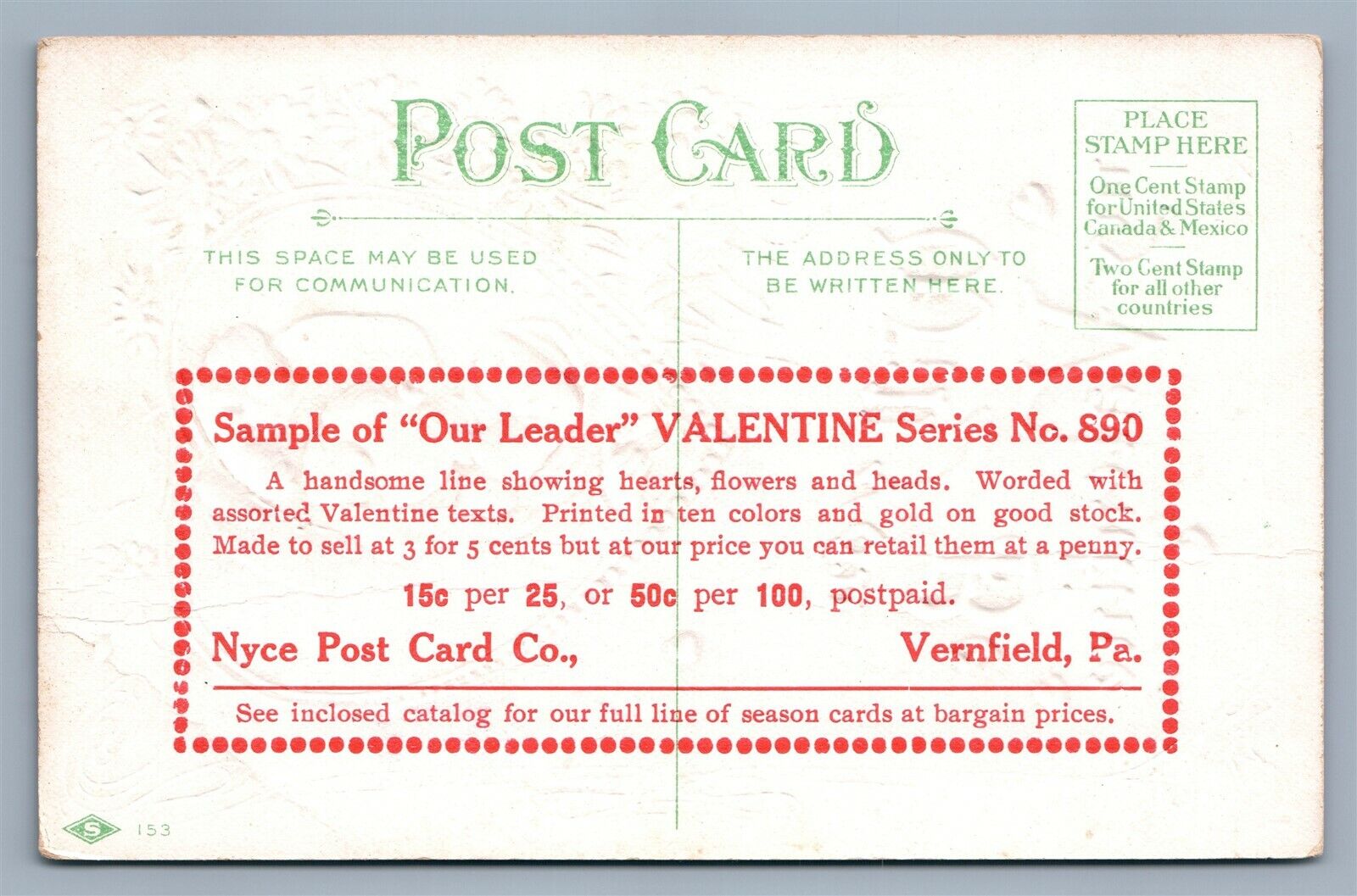 VERNFIELD PA VALENTINE ANTIQUE SAMPLE POSTCARD NYCE POST CARD Co ADVERTISING
