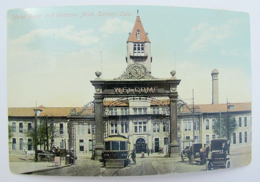 VINTAGE POSTCARD UNION STREET & WELCOME ARCH DENVER CO train railroad railway