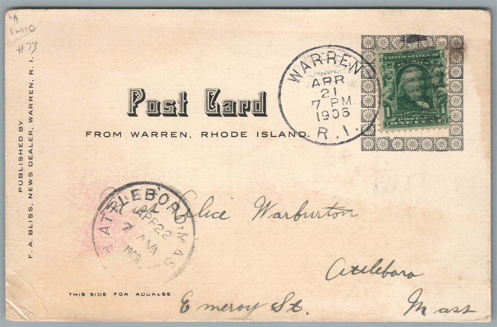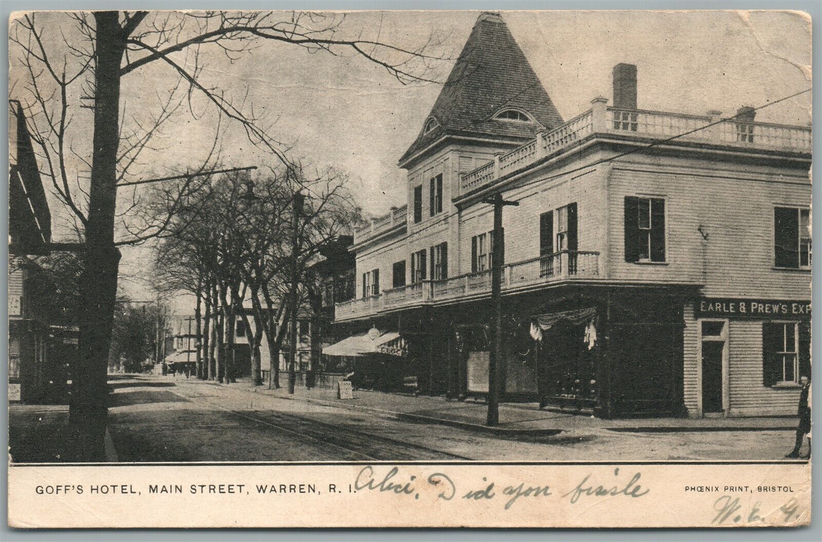 WARREN RI MAIN STREET COFF'S HOTEL ANTIQUE POSTCARD