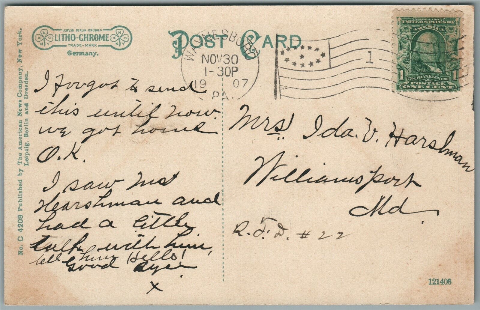 WAYNESBORO PA GERMAN BAPTIST CHURCH ANTIQUE POSTCARD