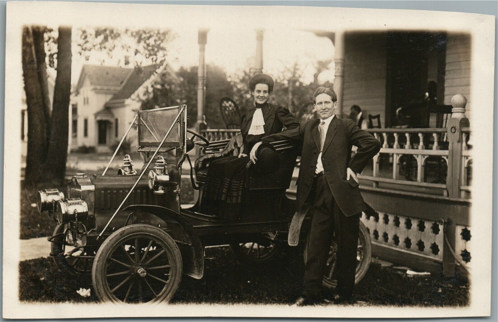 WELL DRESSED COUPLE w/ VINTAGE CAR ANTIQUE REAL PHOTO POSTCARD RPPC