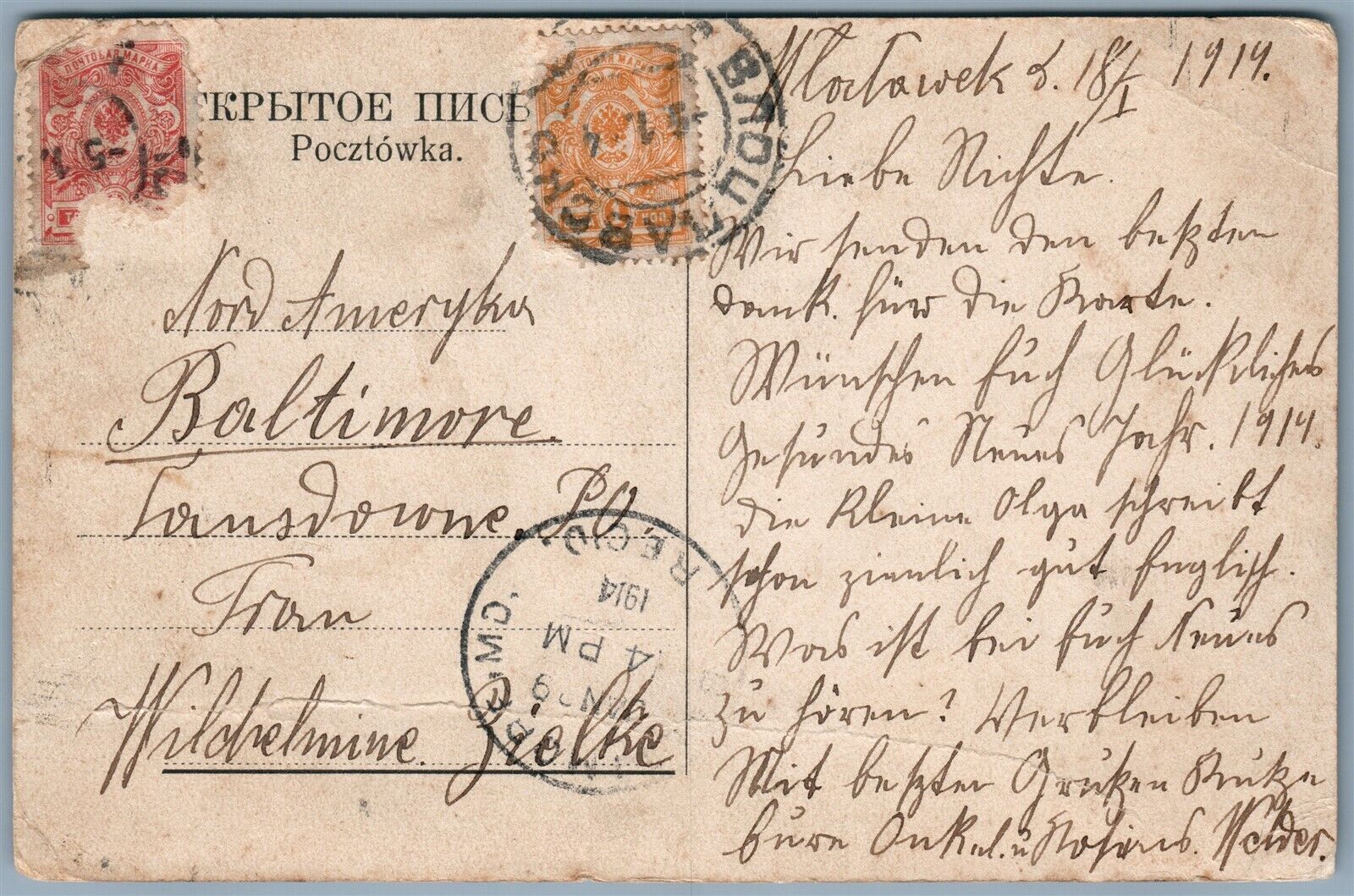 WLOCLAWEK POLAND KOSCIOL 1914 ANTIQUE POSTCARD w/ RUSSIAN IMPERIAL STAMPS