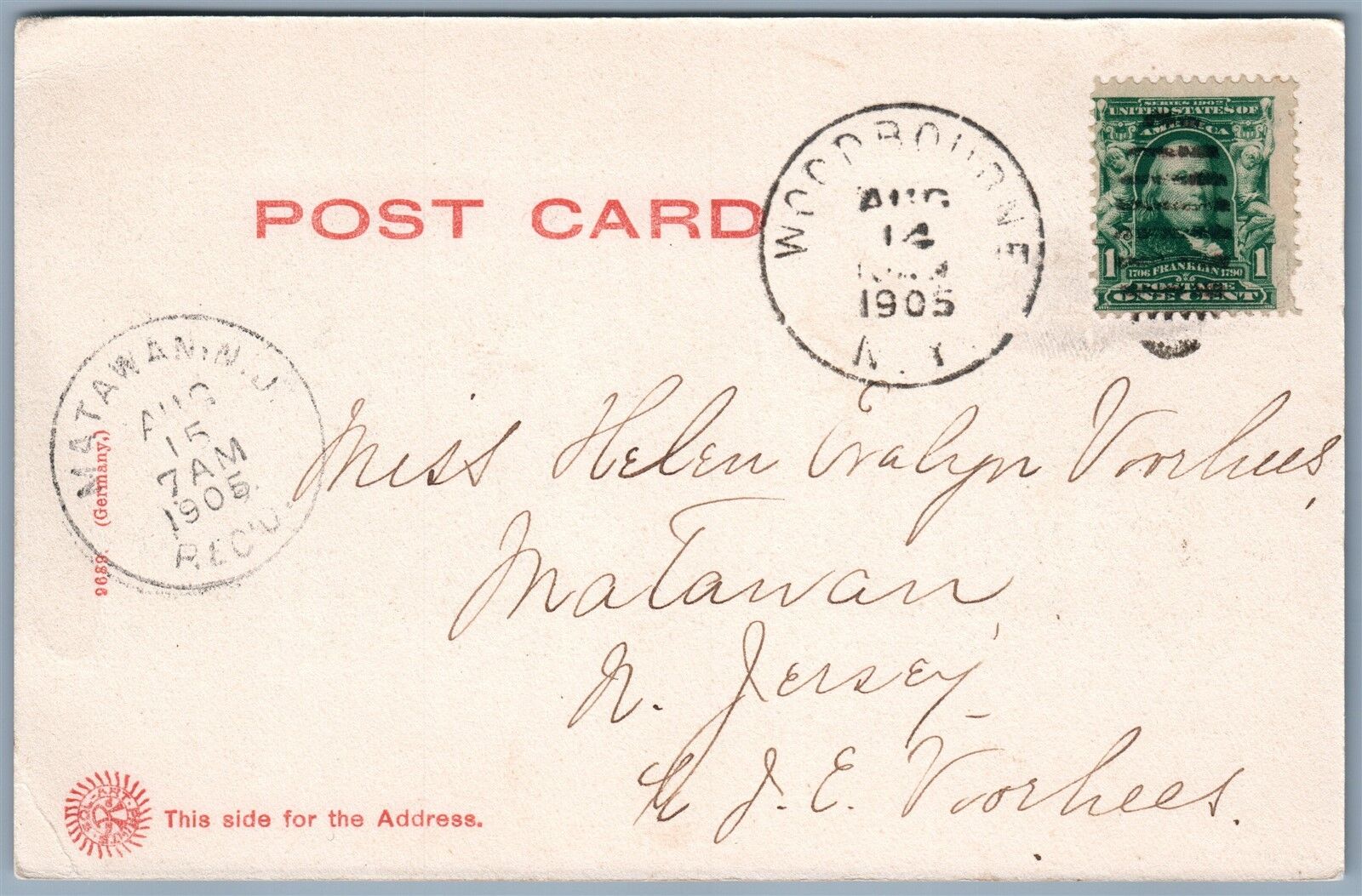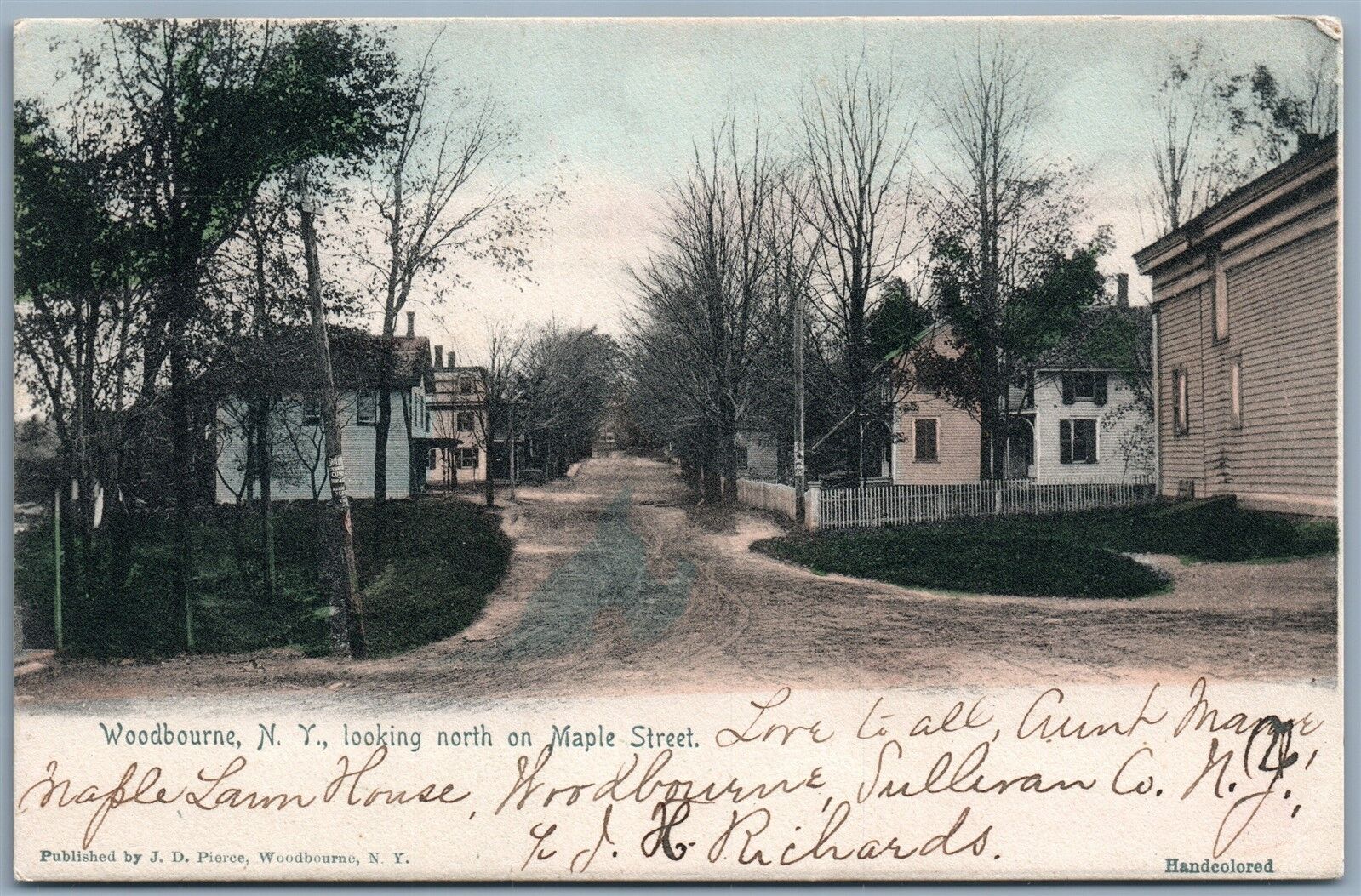 WOODBOURNE NY MAPLE STREET UNDIVIDED 1905 ANTIQUE POSTCARD w/ CORK CANCEL