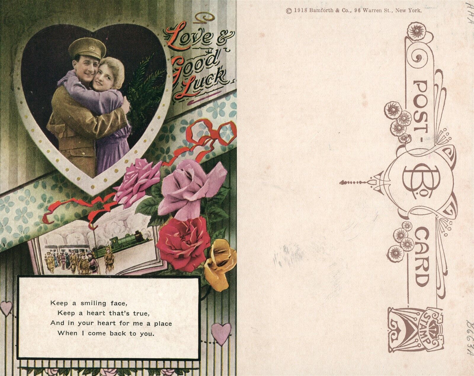WWI RAILROAD STATION LOVE & GOOD LUCK MILITARY ROMANTIC ANTIQUE POSTCARD
