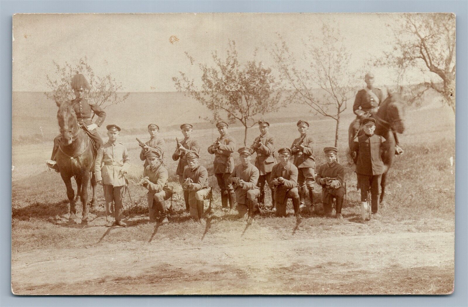 WWI SOLDIERS w/ RIFLES OFFICER on HORSE ANTIQUE REAL PHOTO POSTCARD RPPC