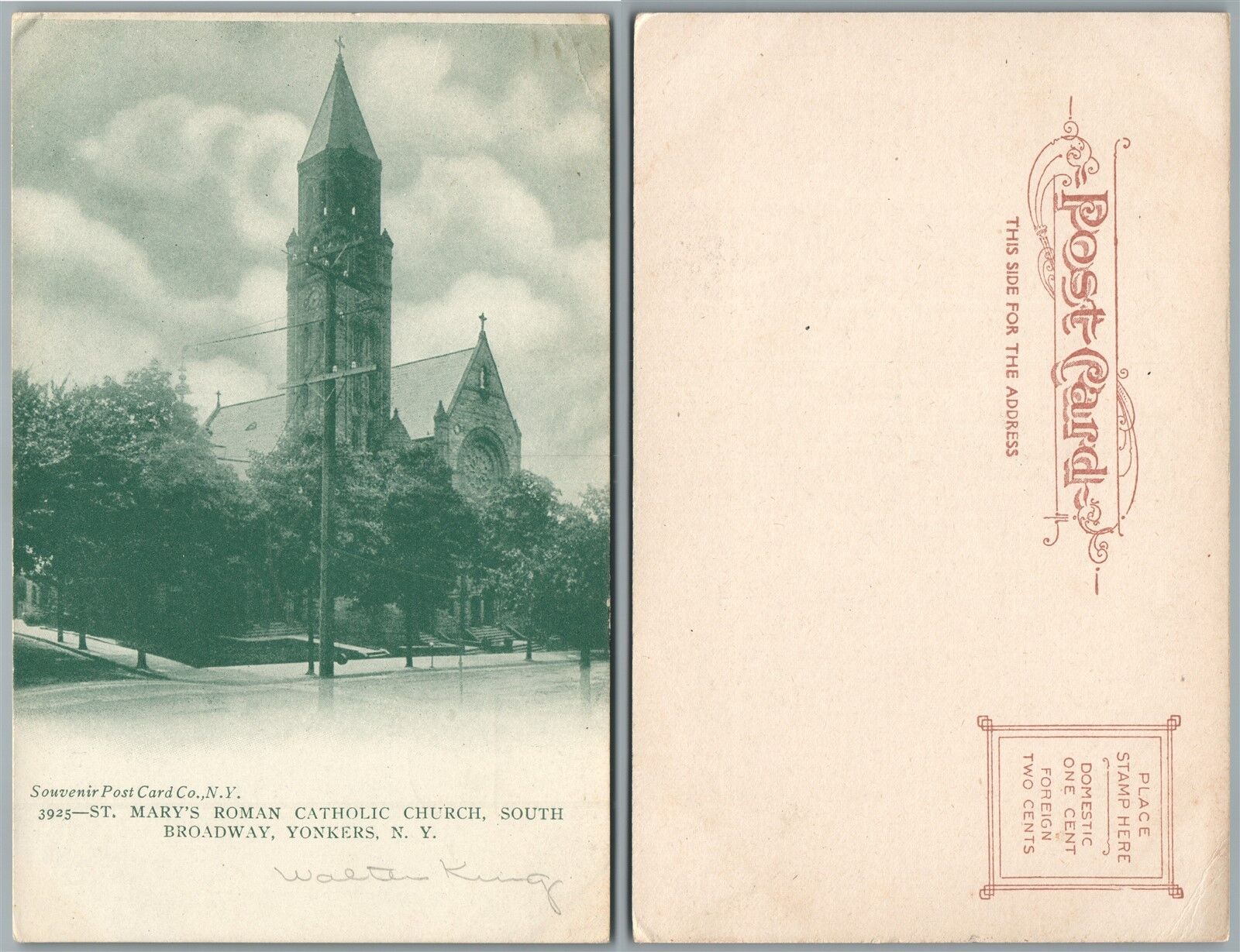YONKERS SOUTH BROADWAY MARY'S ROMAN CATHOLIC CHURCH UNDIVIDED ANTIQUE POSTCARD