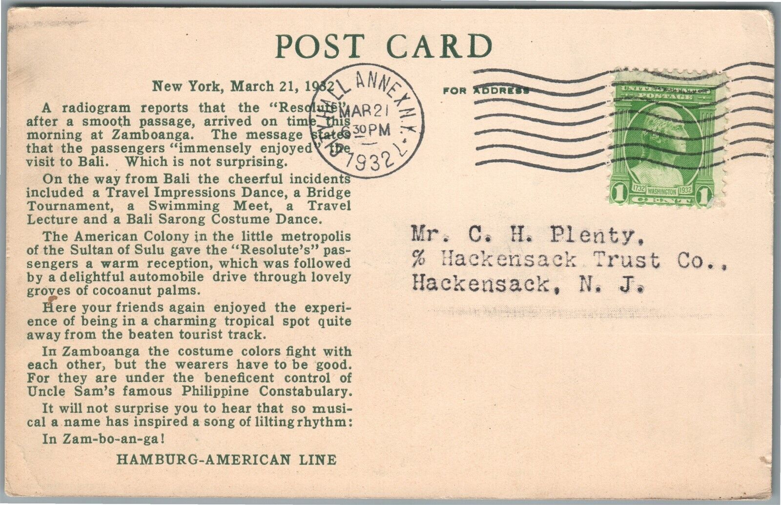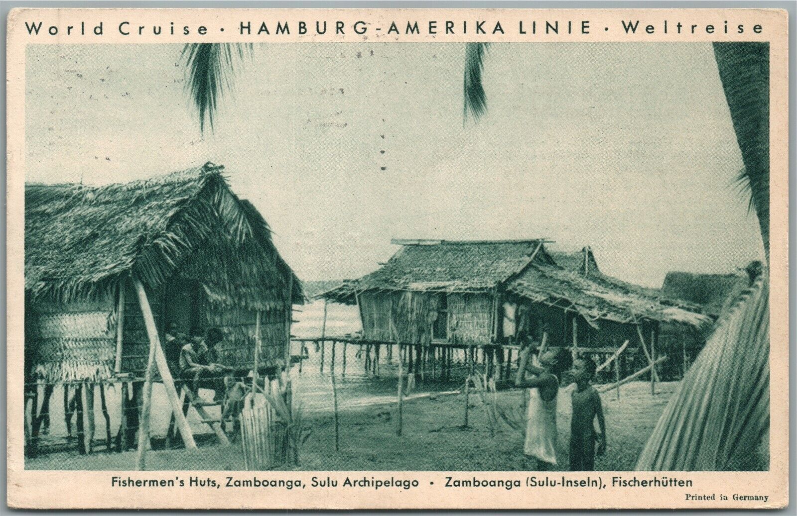 ZULU ARCHIPELAGO ZAMBOANGA FISHERMEN HUTS ANTIQUE HAMBURG AMERICA LINES POSTCARD